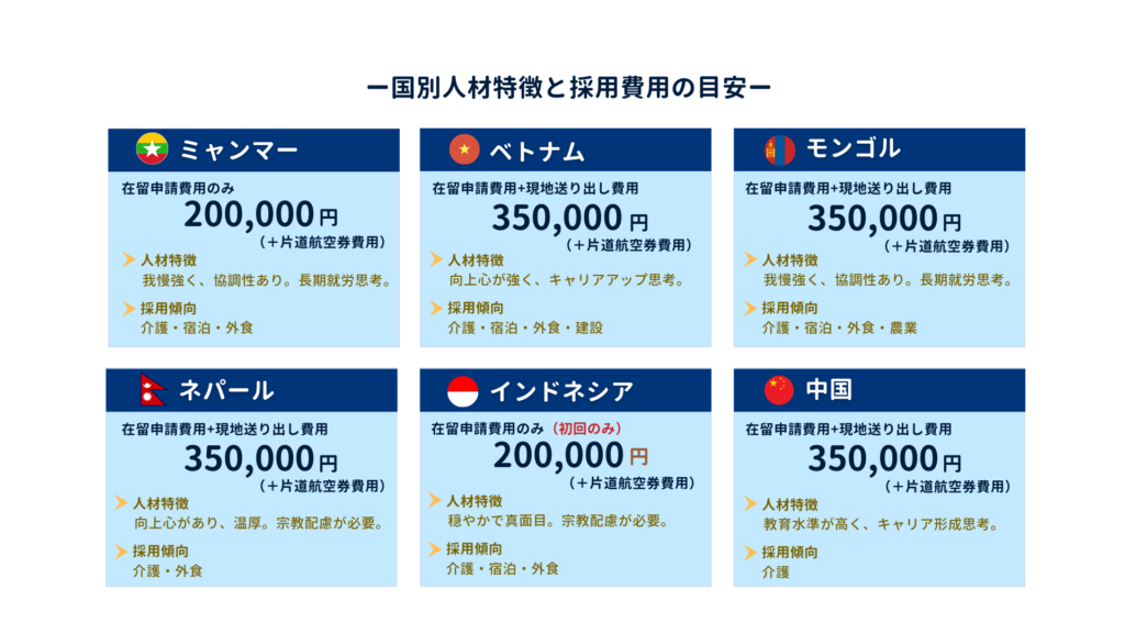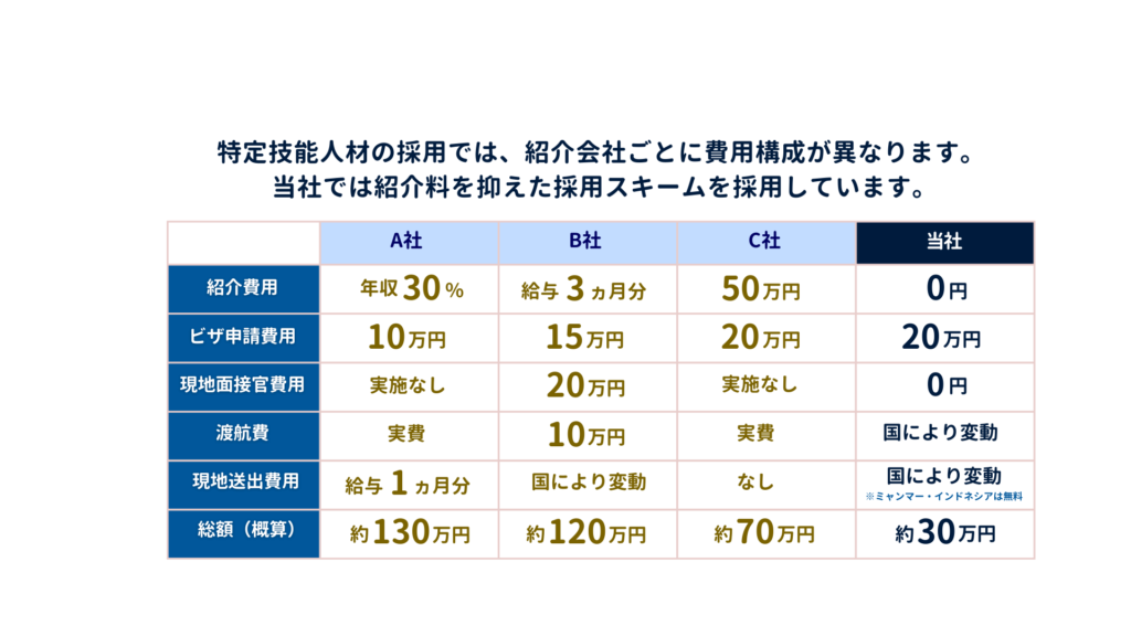 ※実際の費用は、採用条件・国籍・在留状況・支援内容等により異なります。詳しくは個別にご案内いたします。