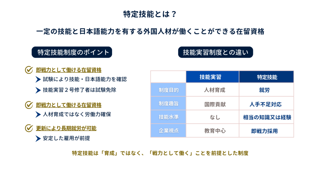 特定技能とは、人手不足が深刻な業種において、一定の技能と日本語能力を有する外国人材が働くことができる在留資格です。